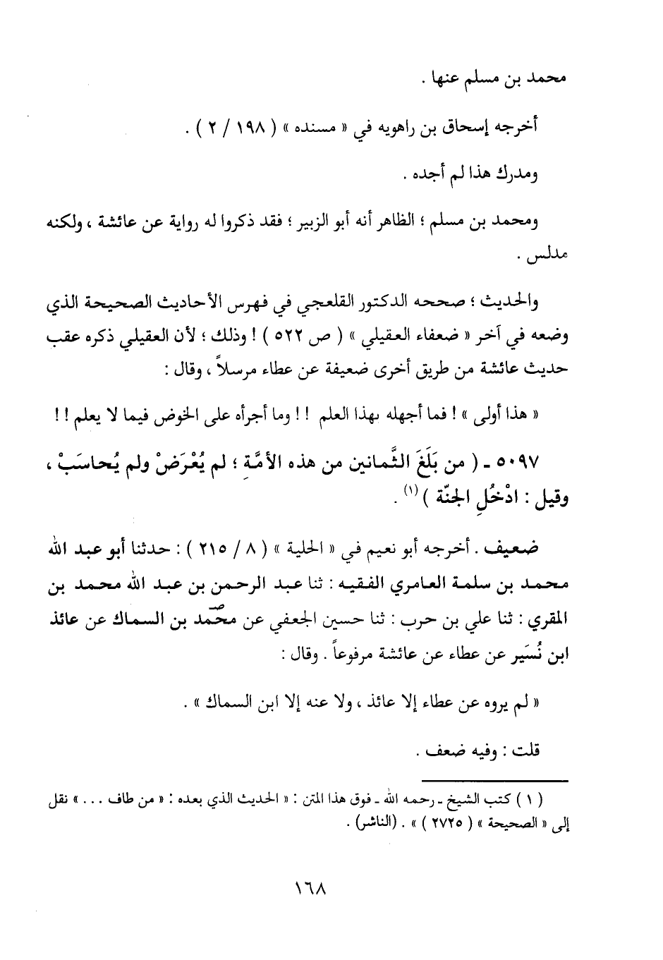 والحديث؛ صححه الدكتور القلعجي في فهرس الأحاديث الصحيحة الذي وضعه في آخر "ضعفاء العقيلي" (ص 522) ! وذلك؛ لأن العقيلي ذكره عقب حديث عائشة من طريق أخرى ضعيفة عن عطاء مرسلاً، وقال: