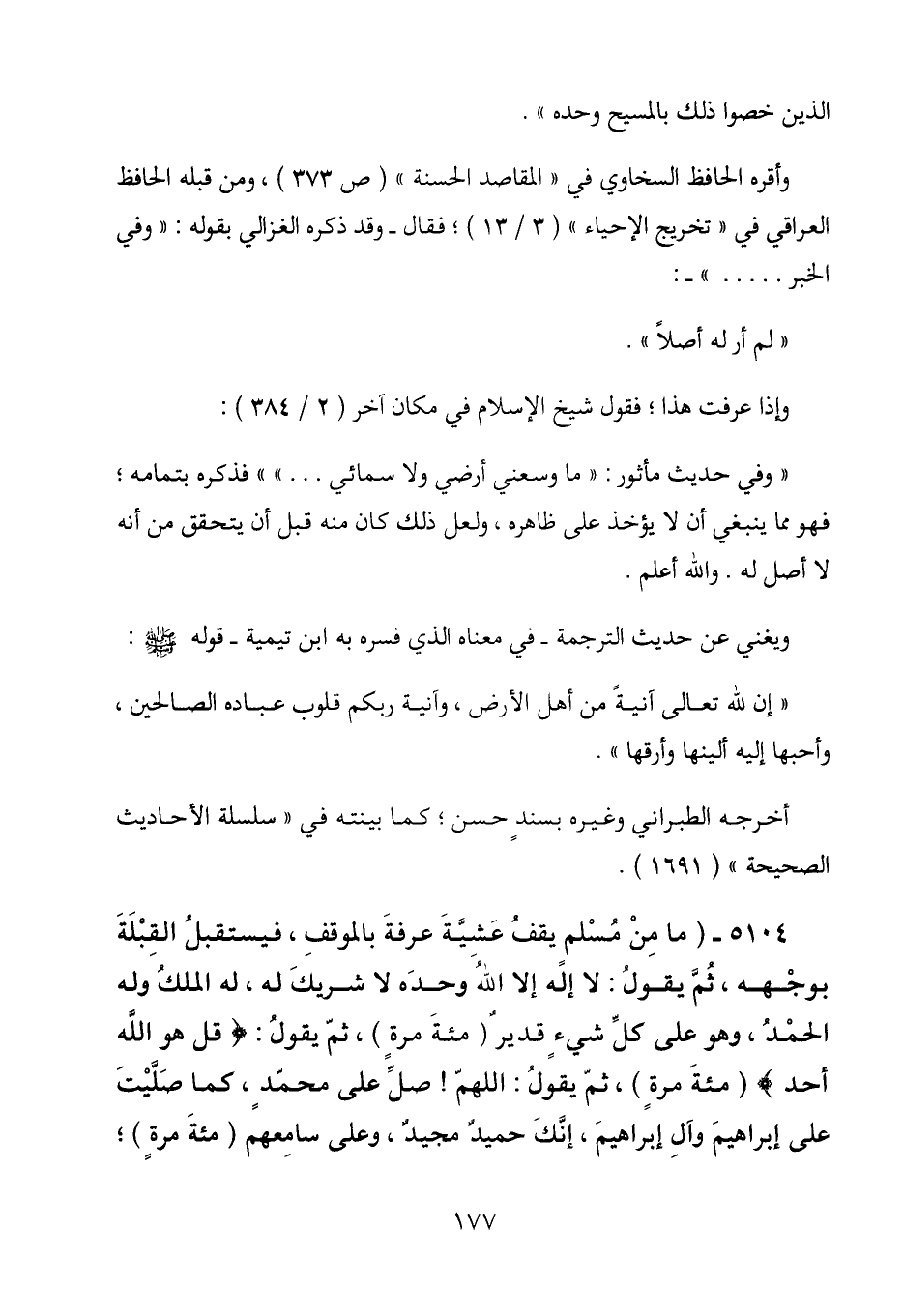 5104 - (ما من مسلم يقف عشية عرفة بالموقف، فيستقبل القبلة بوجهه، ثم يقول: لا إله إلا الله وحده لا شريك له، له الملك وله الحمد، وهو على كل شيء قدير (مئة مرة) ، ثم يقول: (قل هو الله أحد) (مئة مرة) ، ثم يقول: اللهم! صل على محمد، كما صليت على إبراهيم وآل إبراهيم، وإنك حميد مجيد، وعلى سامعهم (مئة مرة) ؛