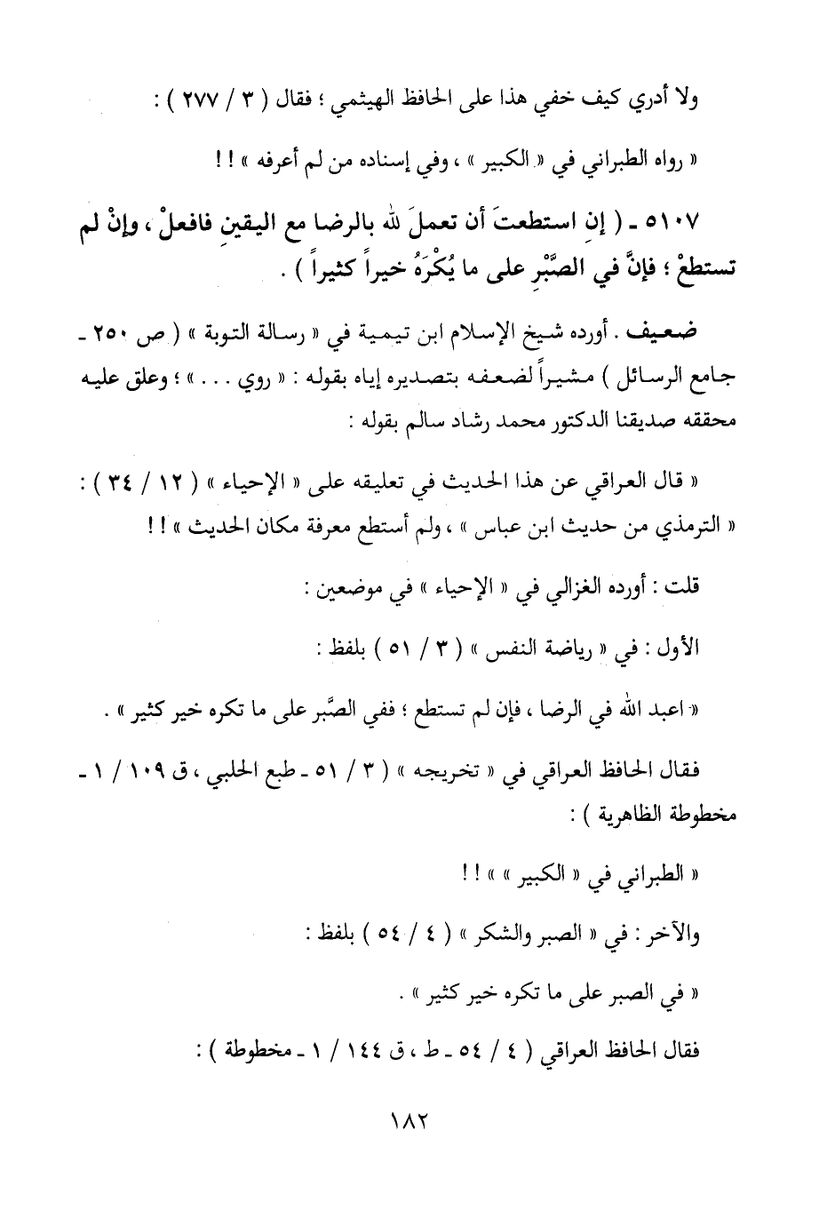 5107 - (إن استطعت أن تعمل لله بالرضا مع اليقين فافعل، وإن لم تستطع؛ فإن في الصبر على ما يكره خيراً كثيراً) .