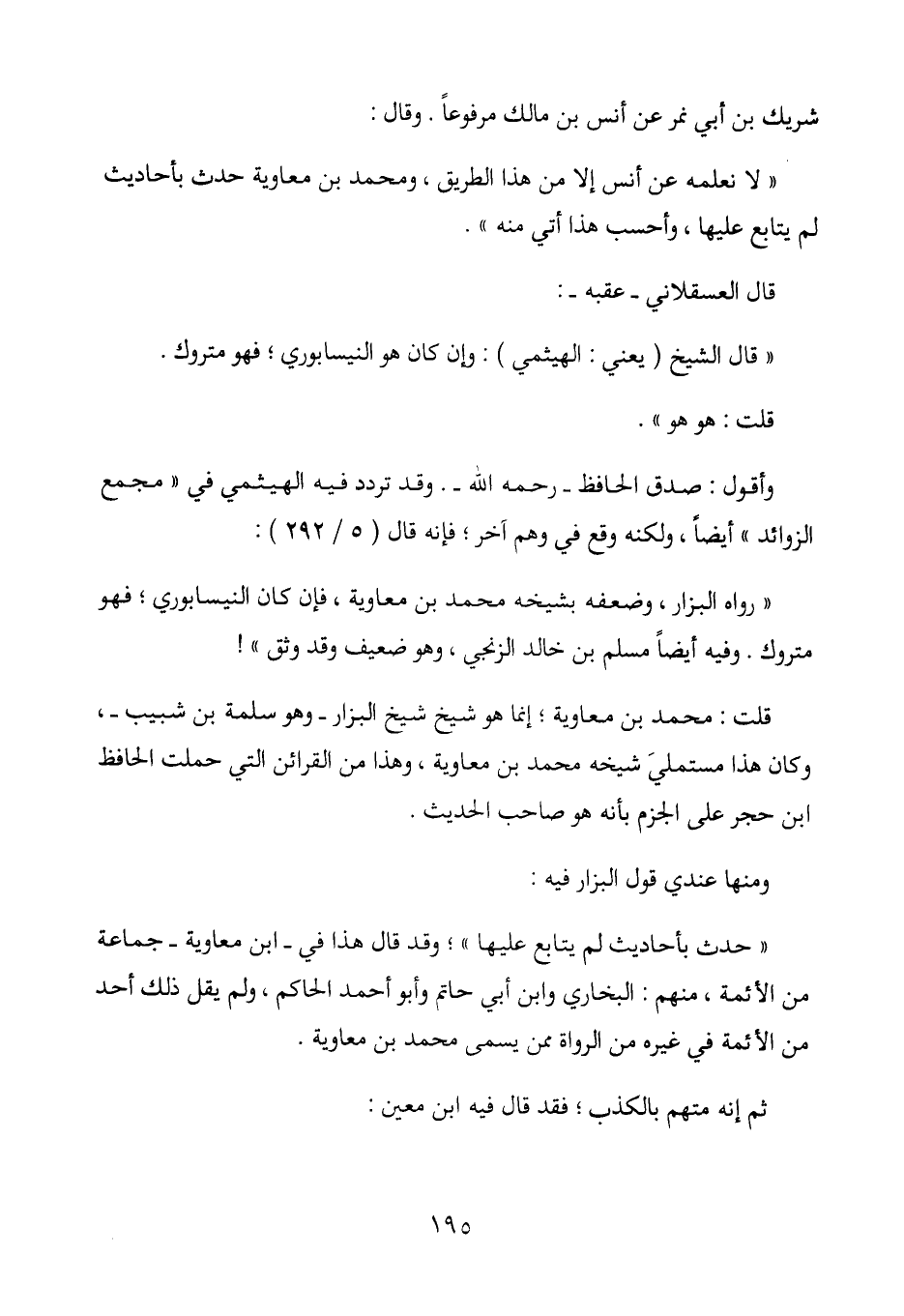 "حدث بأحاديث لم يتابع عليها"؛ وقد قال هذا في - ابن معاوية - جماعة من الأئمة، منهم: البخاري وابن أبي حاتم وأبو أحمد الحاكم، ولم يقل ذلك أحد من الأئمة في غيره من الرواة ممن يسمى محمد بن معاوية.