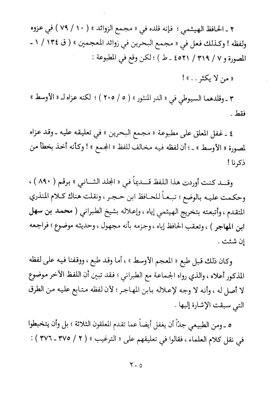 4- غفل المعلق على مطبوعة "مجمع البحرين" في تعليقه عليه - وقد عزاه لمصورة "الأوسط" -؛ أن لفظه فيه مخالف للفظ "المجمع"! وكأنه أخذ بخطأ من ذكرنا!