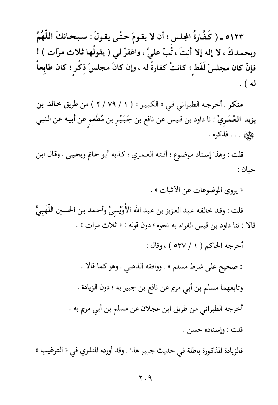 5123 - (كفارة المجلس؛ أن لا يقوم حتى يقول: سبحانك اللهم وبحمدك، لا إله إلا أنت، تب علي، واغفر لي (يقولها ثلاث مرات) ! فإن كان مجلس لغط؛ كانت كفارة له، وإن كان مجلس ذكر؛ كان طابعاً له) .