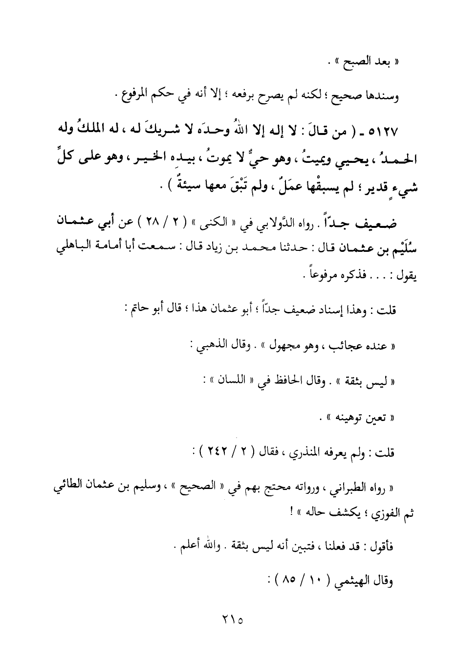 "رواه الطبراني، ورواته محتج بهم في "الصحيح"، وسليم بن عثمان الطائي ثم الفوزي؛ يكشف حاله"!