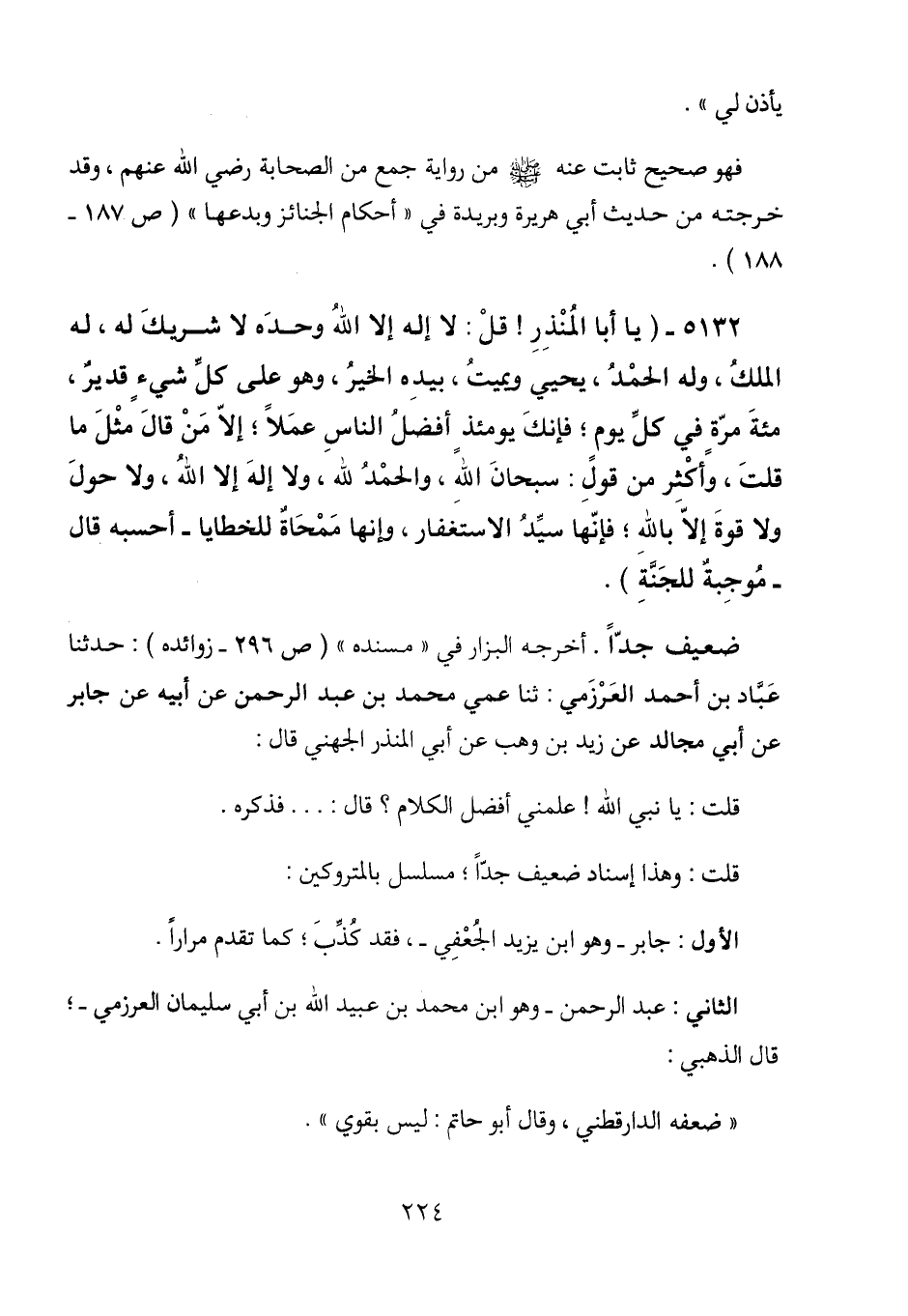 5132 - (يا أبا المنذر! قل لا إله إلا الله وحده لا شريك له، له الملك،وله الحمد، يحيي ويميت، بيده الخير، وهو على كل شيء قدير، مئة مرة في كل يوم؛ فإنك يومئذ أفضل الناس عملاً؛ إلا من قال مثل ما قلت، وأكثر من قول: سبحان الله، والحمد لله، ولا إله إلا الله، ولا حول ولا قوة إلا بالله؛ فإنها سيد الاستغفار، وإنها ممحاة للخطايا - أحسبه قال - موجبة للجنة) .