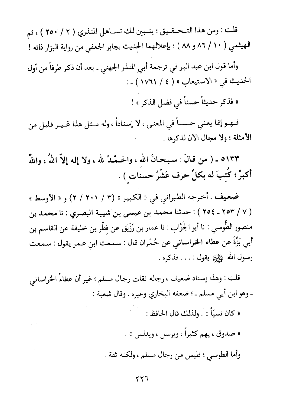 5133 - (من قال: سبحان الله، والحمد لله، ولا إله إلا الله، والله أكبر؛ كتب له بكل حرف عشر حسنات) .