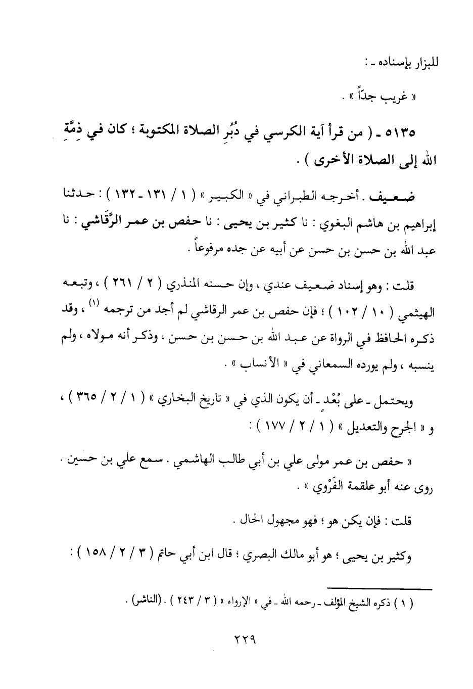 قلت: وهو إسناد ضعيف عندي، وإن حسنه المنذري (2/ 261) ، وتبعه الهيثمي (10/ 102) ؛ فإن حفص بن عمر الرقاشي لم أجد من ترجمه (1) ، وقد ذكره الحافظ في الرواة عن عبد الله بن حسن بن حسن، وذكر أنه مولاه، ولم ينسبه، ولم يورده السمعاني في "الأنساب".