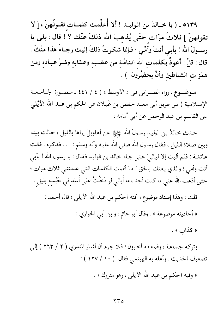 5139 - (يا خالد بن الوليد! ألا أعلمك كلمات تقولهن، [لا تقولهن] ثلاث مرات حتى يذهب الله ذلك عنك؟! قال: بلى يا رسول الله! بأبي أنت وأمي؛ فإنما شكوت ذلك إليك رجاء هذا منك. قال: قل: أعوذ بكلمات الله التامة من غضبه وعقابه وشر عباده ومن همزات الشياطين وأن يحضرون) .