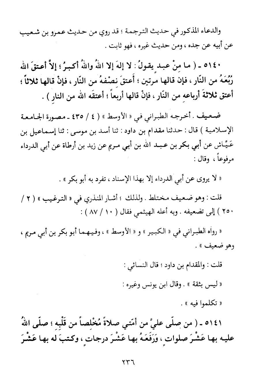 5140 - (ما من عبد يقول: لا إله إلا الله والله أكبر؛ إلا أعتق الله ربعه من النار، فإن قالها مرتين؛ أعتق نصفه من النار، فإن قالها ثلاثاً؛ أعتق ثلاثة أرباعه من النار، فإن قالها أربعاً؛ أعتقه الله من النار) .