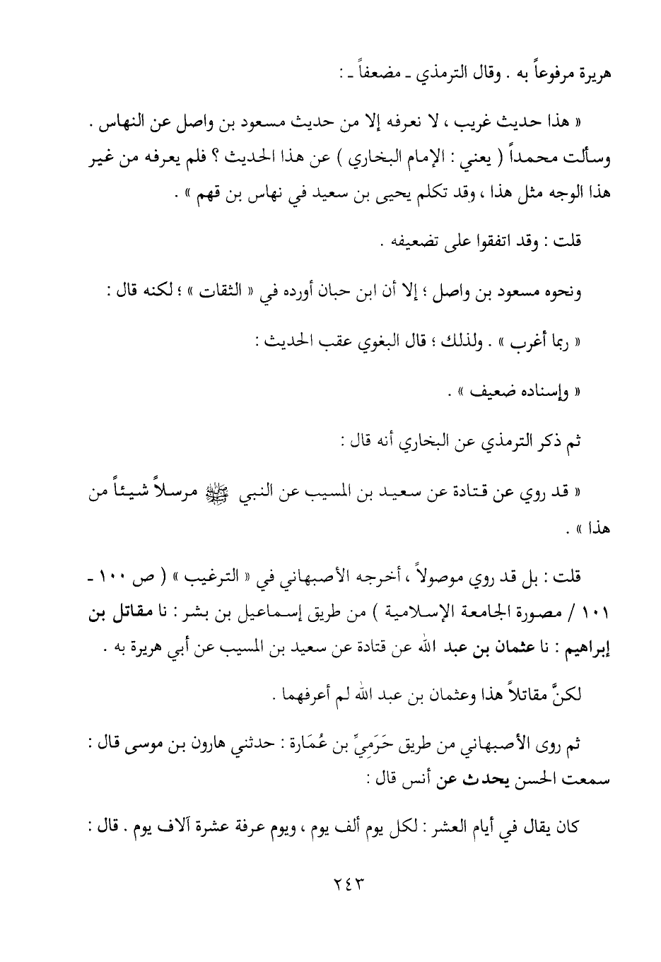 قلت: بل قد روي موصولاً، أخرجه الأصبهاني في "الترغيب" (ص 100-101/ مصورة الجامعة الإسلامية) من طريق إسماعيل بن بشر: أخبرنا مقاتل بن إبراهيم: أخبرنا عثمان بن عبد الله عن قتادة عن سعيد بن المسيب عن أبي هريرة به.