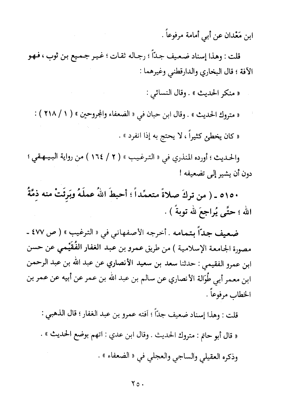 5150 - (من ترك صلاة متعمداً؛ أحبط الله عمله وبرئت منه ذمة الله؛ حتى يراجع لله توبة) .