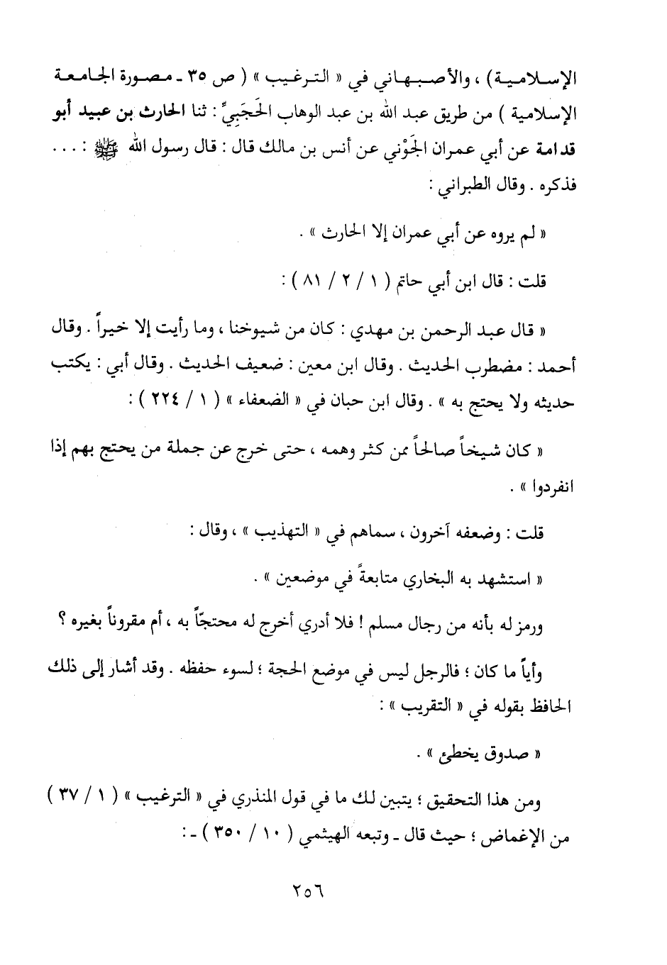 الإسلامية) ، والأصبهاني في "الترغيب" (ص 35 - مصورة الجامعة الإسلامية) من طريق عبد الله بن عبد الوهاب الحجبي: حدثنا الحارث بن عبيد أبو قدامة عن أبي عمران الجوني عن أنس بن مالك قال: قال رسول الله - صلى الله عليه وسلم -: ... فذكره. وقال الطبراني: