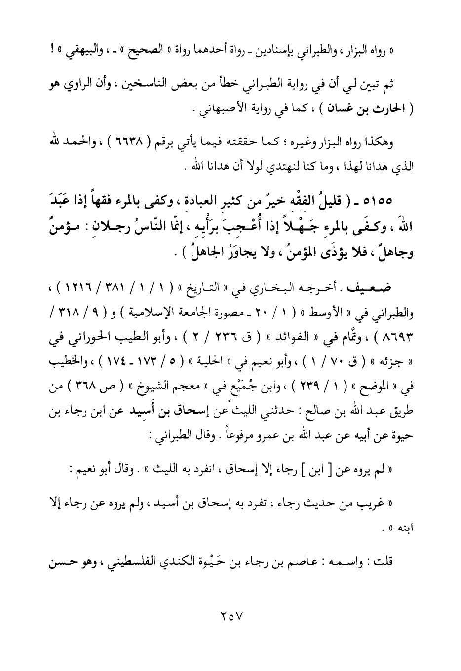 5155 - (قليل الفقه خير من كثيرالعبادة، وكفى بالمرء فقهاً إذا عبد الله، وكفى بالمرء جهلاً إذا أعجب برأيه، إنما الناس رجلان: مؤمن وجاهل، فلا يؤذى المؤمن، ولا يجاور الجاهل) .