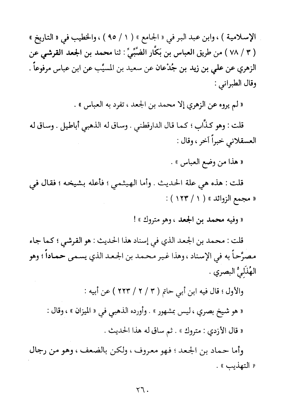الإسلامية) ، وابن عبد البر في "الجامع" (1/ 95) ، والخطيب في "التاريخ" (3/ 78) من طريق العباس بن بكار الضبي: حدثنا محمد بن الجعد القرشي عن الزهري عن علي بن زيد بن جدعان عن سعيد بن المسيب عن ابن عباس مرفوعاً. وقال الطبراني: