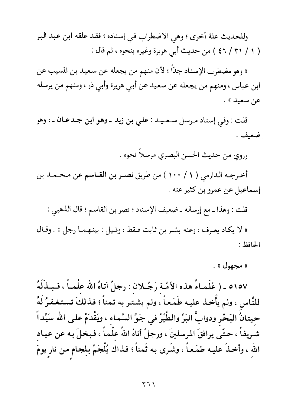 5157 - (علماء هذه الأمة رجلان: رجل آتاه الله علماً، فبذله للناس، ولم يأخذ عليه طمعاً، ولم يشتر به ثمناً؛ فذلك تستغفر له حيتان البحر ودواب البر والطير في جو السماء، ويقدم على الله سيداً شريفاً، حتى يرافق المرسلين، ورجل آتاه الله علماً، فبخل به عن عباد الله، وأخذ عليه طمعاً، وشرى به ثمناً؛ فذاك يلجم بلجام من نار يوم