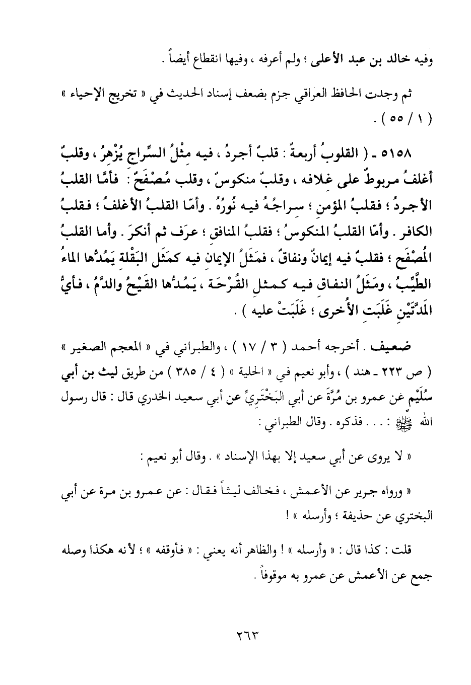 5158 - (القلوب أربعة: قلب أجرد، فيه مثل السراج يزهر، وقلب أغلف مربوط على غلافه، وقلب منكوس، وقلب مصفح: فأما القلب الأجرد؛ فقلب المؤمن؛ سراجه فيه نوره. وأما القلب الأغلف؛ فقلب الكافر. وأما القلب المنكوس؛ فقلب المنافق؛ عرف ثم أنكر. وأما القلب المصفح؛ فقلب فيه إيمان ونفاق، فمثل الإيمان فيه كمثل البقلة يمدها الماء الطيب، ومثل النفاق فيه كمثل القرحة، يمدها القيح والدم، فأي المدتين غلبت الأخرى؛ غلبت عليه) .