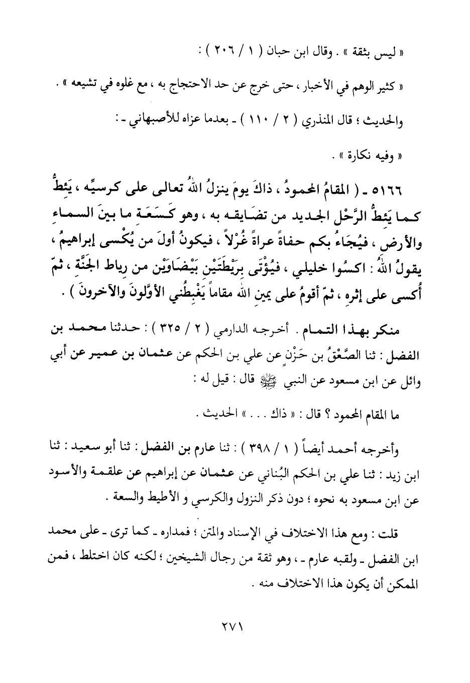 قلت: ومع هذا الاختلاف في الإسناد والمتن؛ فمداره - كما ترى - على محمد ابن الفضل - ولقبه عارم -، وهو ثقة من رجال الشيخين؛ لكنه كان اختلط، فمن الممكن أن يكون هذا الاختلاف منه.