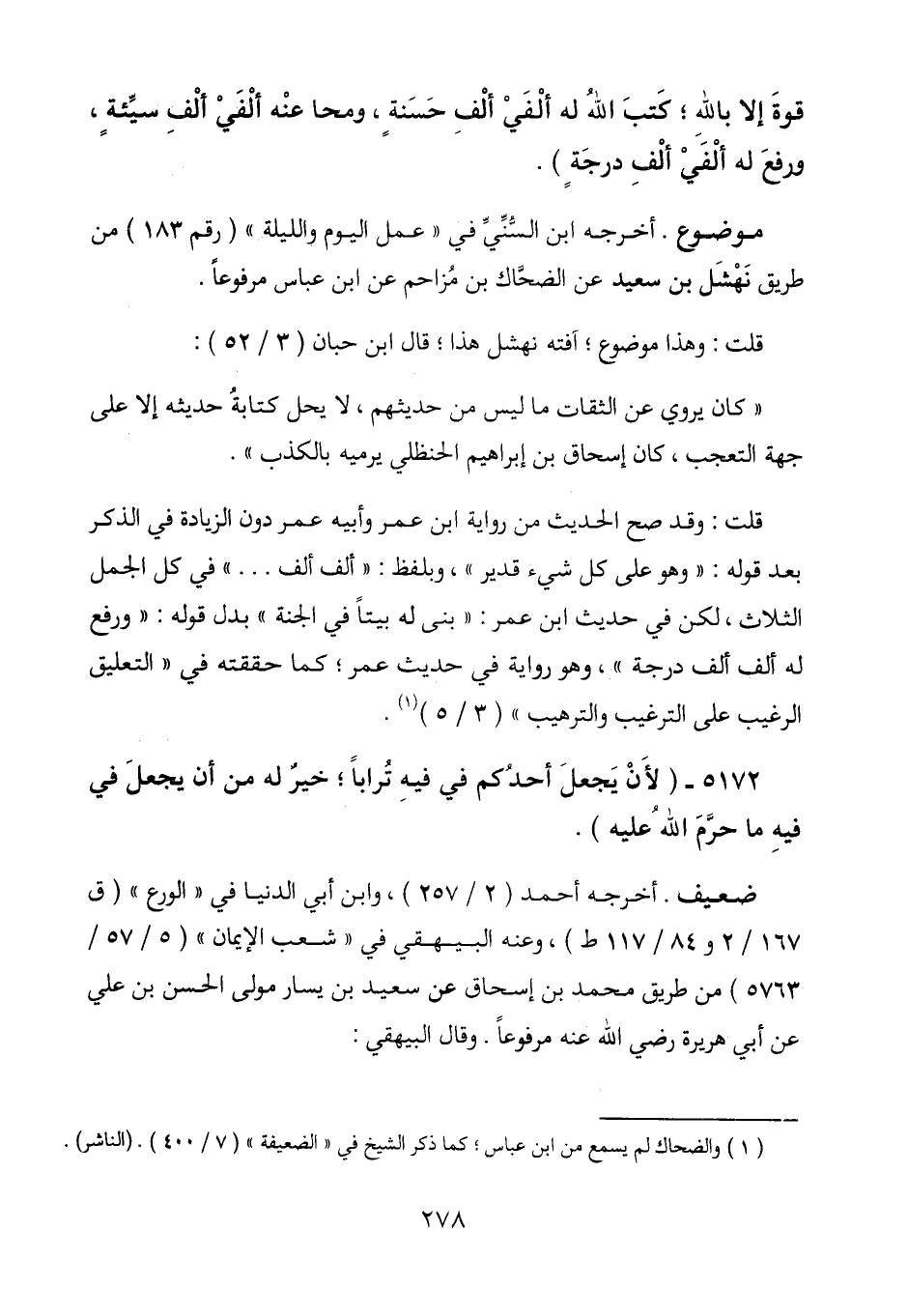 قلت: وقد صح الحديث من رواية ابن عمر وأبيه عمر دون الزيادة في الذكر بعد قوله: " وهو على كل شيء قدير"، وبلفظ: "ألف ألف ... " في كل الجمل الثلاث، لكن في حديث ابن عمر: "بنى له بيتاً في الجنة" بدل قوله: "ورفع له ألف ألف درجة"، وهو رواية في حديث عمر؛ كما حققته في "التعليق الرغيب على الترغيب والترهيب" (3/ 5) (1) .