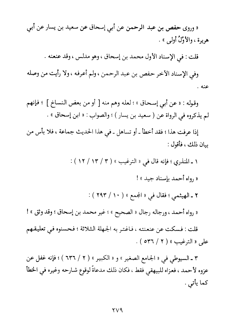 "وروى حفص بن عبد الرحمن عن أبي إسحاق عن سعيد بن يسار عن أبي هريرة، والأول أولى".