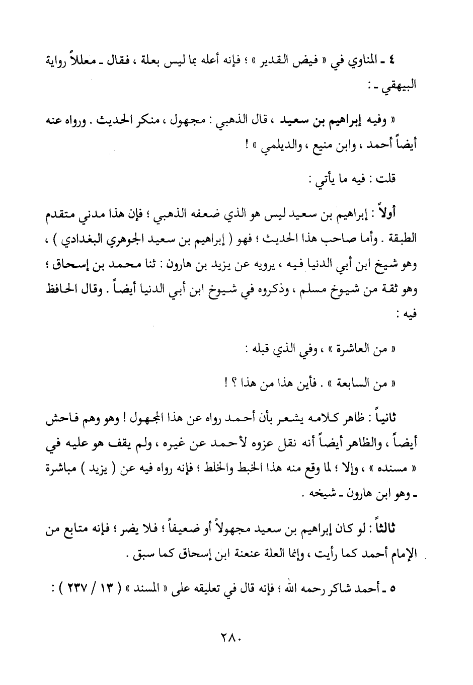 ثالثاً: لو كان إبراهيم بن سعيد مجهولاً أو تضعيفاً؛ فلا يضر؛ فإنه متابع من الإمام أحمد كما رأيت، وإنما العلة عنعنة ابن إسحاق كما سبق.
