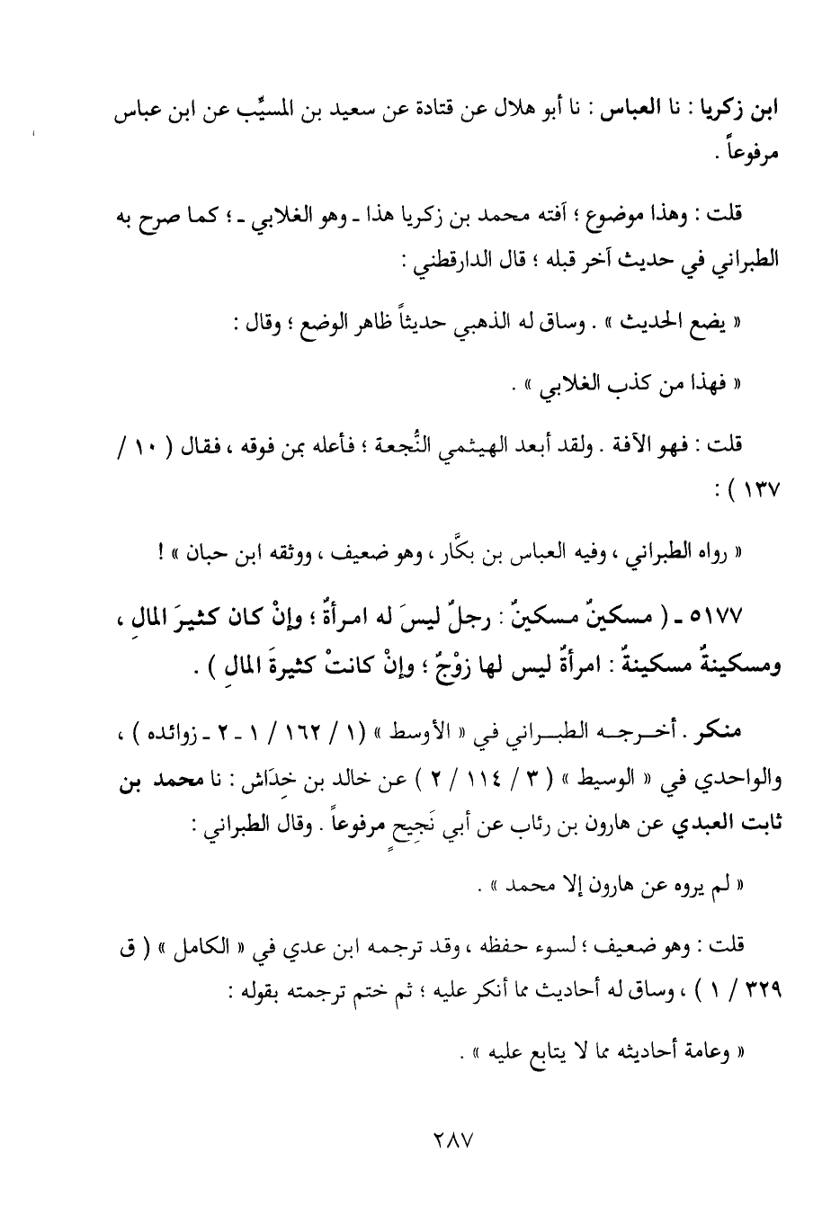 قلت: وهذا موضوع؛ آفته محمد بن زكريا هذا - وهو الغلابي -؛ كما صرح به الطبراني في حديث آخر قبله؛ قال الدارقطني: