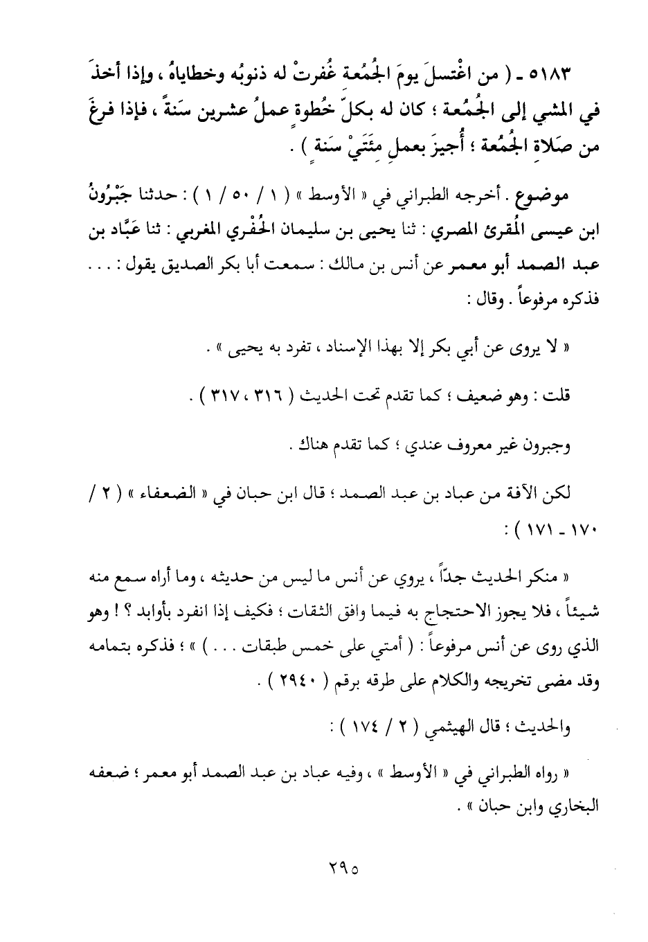 "منكر الحديث جداً، يروي عن أنس ما ليس من حديثه، وما أراه سمع منه شيئاً، فلا يجوز الاحتجاج به فيما وافق الثقات؛ فكيف إذا انفرد بأوابد؟! وهو الذي روى عن أنس مرفوعاً: (أمتي على خمس طبقات ... ) "؛ فذكره بتمامه وقد مضى تخريجه والكلام على طرقه برقم (2940) .