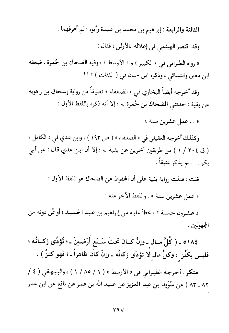وقد أخرجه أيضاً البخاري في "الضعفاء" تعليقاً من رواية إسحاق بن راهويه عن بقية: حدثني الضحاك بن حمرة به؛ إلا أنه ذكره باللفظ الأول: