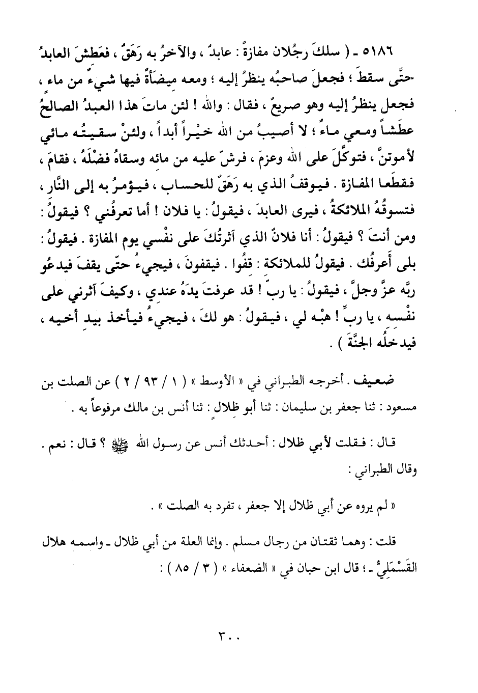 5186 - (سلك رجلان مفازة: عابد، والآخر به رهق، فعطش العابد حتى سقط؛ فجعل صاحبه ينظر إليه؛ ومعه ميضأة فيها شيء من ماء، فجعل ينظر إليه وهو صريع، فقال: والله! لئن مات هذا العبد الصالح عطشاً ومعي ماء؛ لا أصيب من الله خيراً أبداً، ولئن سقيته مائي لأموتن، فتوكل على الله وعزم، فرش عليه من مائه وسقاه فضله، فقام، فقطعا المفازة. فيوقف الذي به رهق للحساب، فيؤمر به إلى النار، فتسوقه الملائكة، فيرى العابد، فيقول: يا فلان! أما تعرفني؟ فيقول: ومن أنت؟ فيقول: أنا فلان الذي آثرتك على نفسي يوم المفازة. فيقول: بلى أعرفك. فيقول للملائكة: قفوا. فيقفون، فيجيء حتى يقف فيدعو ربه عز وجل، فيقول: يا رب! قد عرفت يده عندي، وكيف آثرني على نفسه، يا رب! هبه لي، فيقول: هو لك، فيجيء فيأخذ بيد أخيه، فيدخله الجنة) .