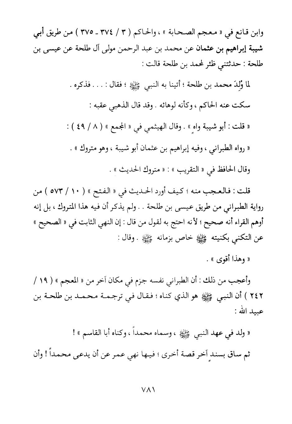 وأعجب من ذلك: أن الطبراني نفسه جزم في مكان آخر من "المعجم" (19/ 242) أن النبي - صلى الله عليه وسلم - هو الذي كناه؛ فقال في ترجمة محمد بن طلحة بن عبيد الله: