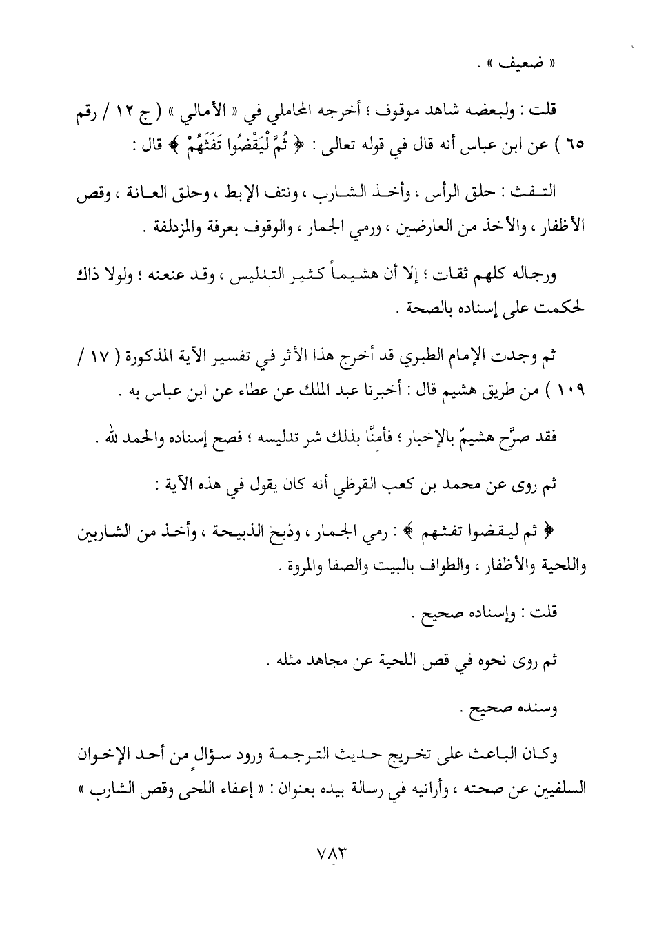 قلت: ولبعضه شاهد موقوف؛ أخرجه المحاملي في "الأمالي" (ج 12/ رقم 65) عن ابن عباس أنه قال في قوله تعالى: (ثم ليقضوا تفثهم) قال: