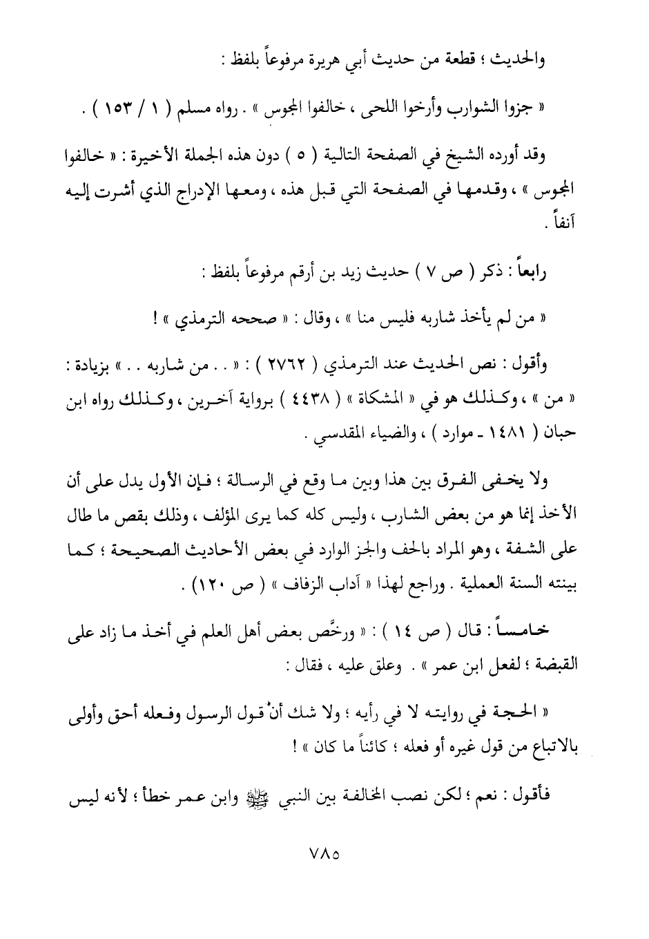 وقد أورده الشيخ في الصفحة التالية (5) دون هذه الجملة الأخيرة: "خالفوا المجوس"، وقدمها في الصفحة التي قبل هذه، ومعها الإدراج الذي أشرت إليه آنفاً.