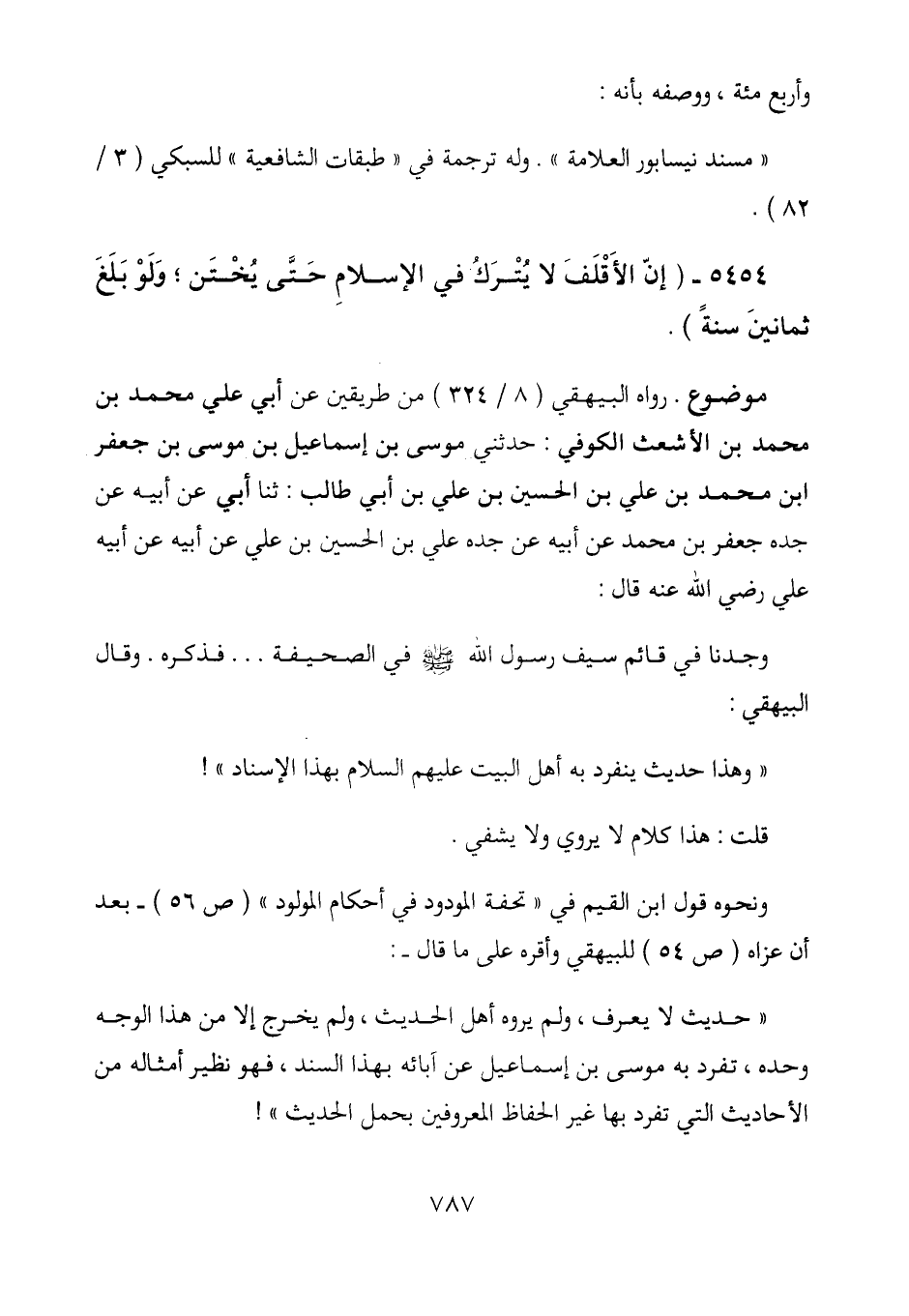 رواه البيهقي (8/ 324) من طريقين عن أبي علي محمد بن محمد بن الأشعث الكوفي: حدثني موسى بن إسماعيل بن موسى بن جعفر ابن محمد بن علي بن الحسين بن علي بن أبي طالب: حدثنا أبي عن أبيه عن جده جعفر بن محمد عن أبيه عن جده علي بن الحسين بن علي عن أبيه عن أبيه علي رضي الله عنه قال: