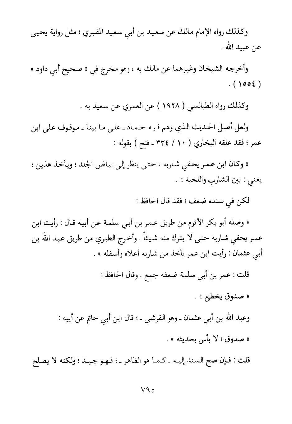 ولعل أصل الحديث الذي وهم فيه حماد - على ما بينا - موقوف على ابن عمر؛ فقد علقه البخاري (10/ 334 - فتح) بقوله: