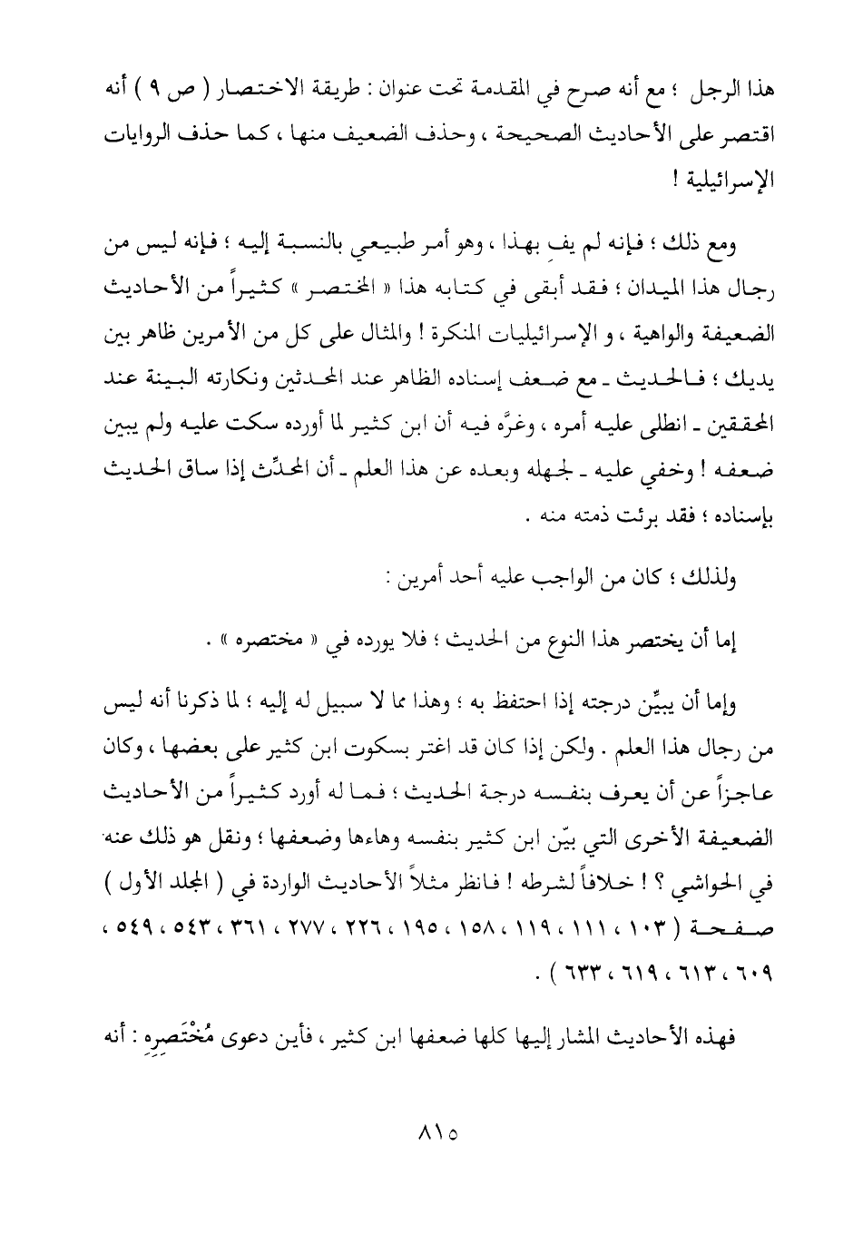 وإما أن يبين درجته إذا احتفظ به؛ وهذا مما لا سبيل له إليه؛ لما ذكرنا أنه ليس من رجال هذا العلم. ولكن إذا كان قد اغتر بسكوت ابن كثير على بعضها، وكان عاجزاً عن أن يعرف بنفسه درجة الحديث؛ فما له أورد كثيراً من الأحاديث الضعيفة الأخرى التي بين ابن كثير بنفسه وهاءها وضعفها؛ ونقل هو ذلك عنه في الحواشي؟! خلافاً لشرطه! فانظر مثلاً الأحاديث الواردة في (المجلد الأول) صفحة (103، 111، 119، 158، 195، 226، 277، 361، 543، 549، 609، 613، 619، 633) .