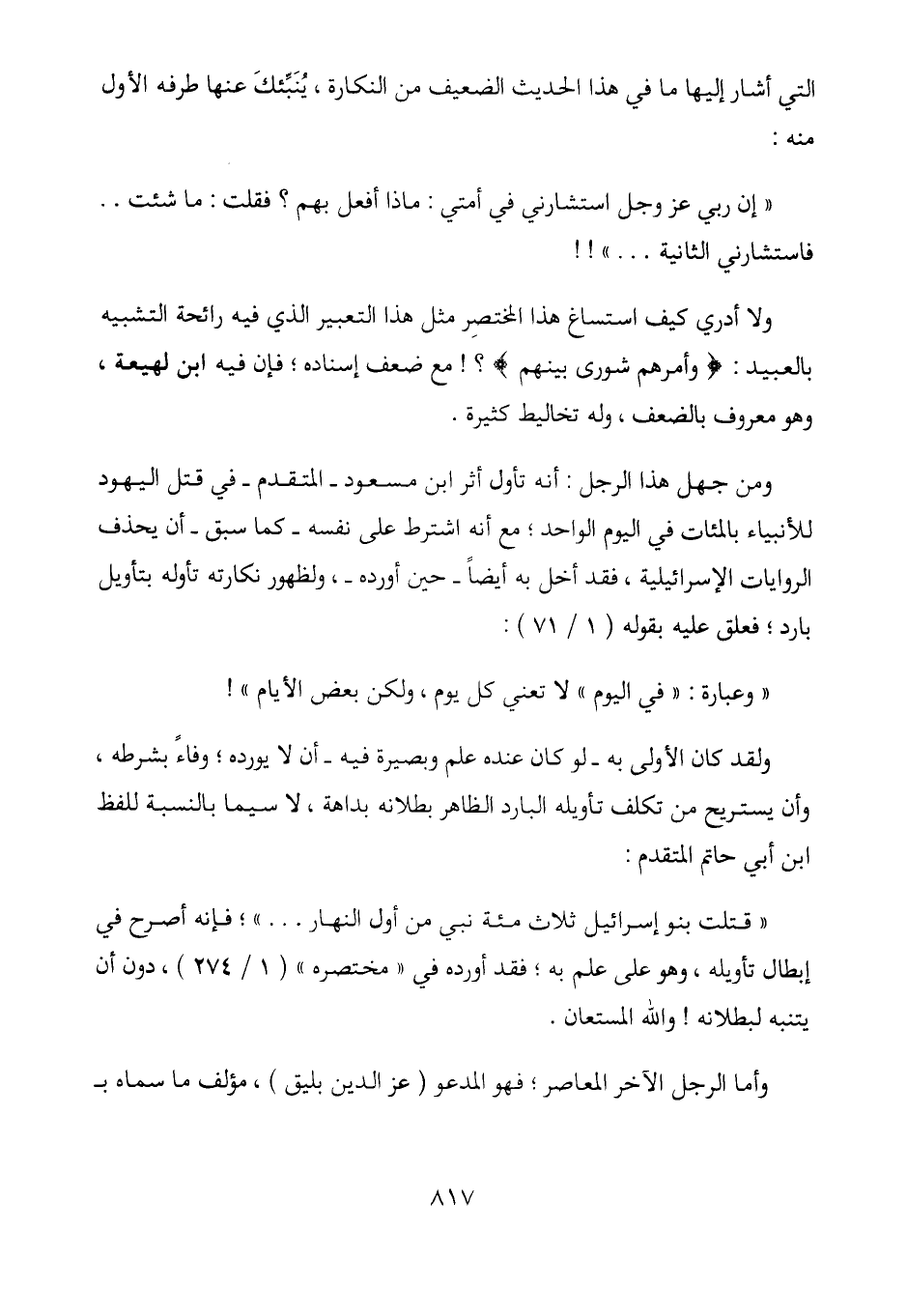 "قتلت بنو إسرائيل ثلاث مئة نبي من أول النهار ... "؛ فإنه أصرح في إبطال تأويله، وهو على علم به؛ فقد أورده في "مختصره" (1/ 274) ، دون أن يتنبه لبطلانه! والله المستعان.