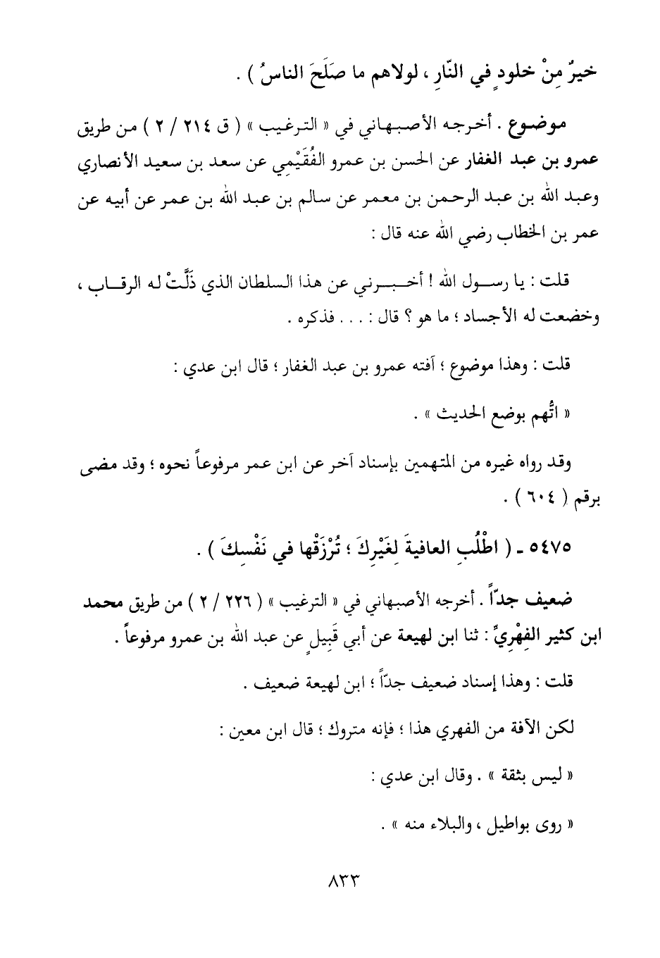 أخرجه الأصبهاني في "الترغيب" (ق 214/ 2) من طريق عمرو بن عبد الغفار عن الحسن بن عمرو الفقيمي عن سعد بن سعيد الأنصاري وعبد الله بن عبد الرحمن بن معمر عن سالم بن عبد الله بن عمر عن أبيه عن عمر بن الخطاب رضي الله عنه قال:
