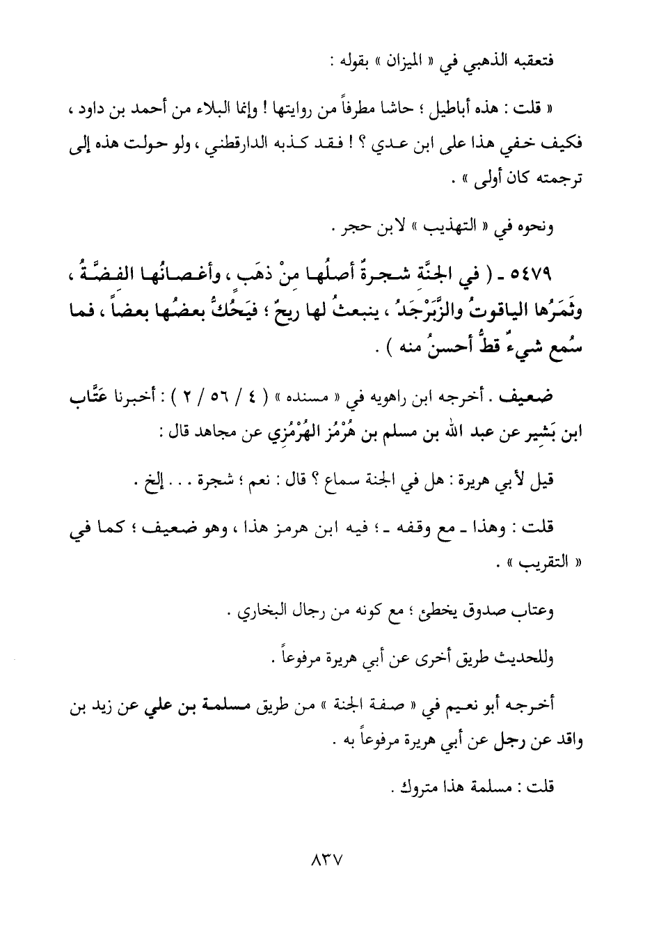 5479 - (في الجنة شجرة أصلها من ذهب، وأغصانها الفضة، وثمرها الياقوت والزبرجد، ينبعث لها ريح؛ فيحك بعضها بعضاً، فما سمع شيء قط أحسن منه) .