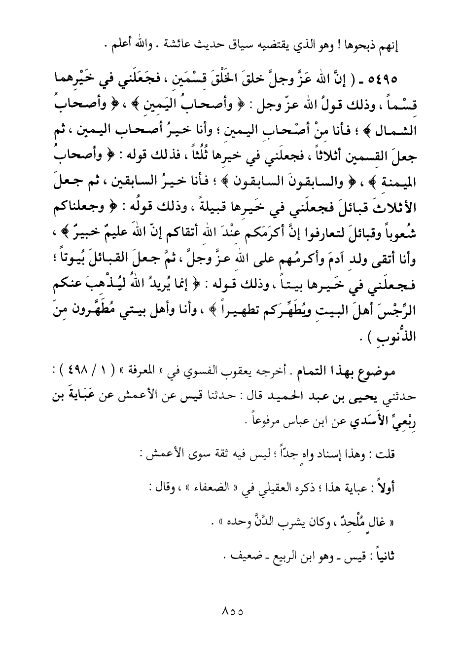 5495 - (إن الله عز وجل خلق الخلق قسمين، فجعلني في خيرهما قسماً، وذلك قول الله عز وجل: (وأصحاب اليمين) ، (وأصحاب الشمال) ؛ فأنا من أصحاب اليمين؛ وأنا خير أصحاب اليمين، ثم جعل القسمين أثلاثاً، فجعلني في خيرها ثلثاً، فذلك قوله: (وأصحاب الميمنة) ، (والسابقون السابقون) ؛ فأنا خير السابقين، ثم جعل الأثلاث قبائل فجعلني في خيرها قبيلة، وذلك قوله: (وجعلناكم شعوباً وقبائل لتعارفوا إن أكرمكم عند الله أتقاكم إن الله عليم خبير) ، وأنا أتقى ولد آدم وأكرمهم على الله عز وجل، ثم جعل القبائل بيوتاً؛ فجعلني في خيرها بيتاً، وذلك قوله: (إنما يريد ليذهب عنكم الرجس أهل البيت ويطهركم تطهيراً) ، وأنا وأهل بيتي مطهرون من الذنوب) .