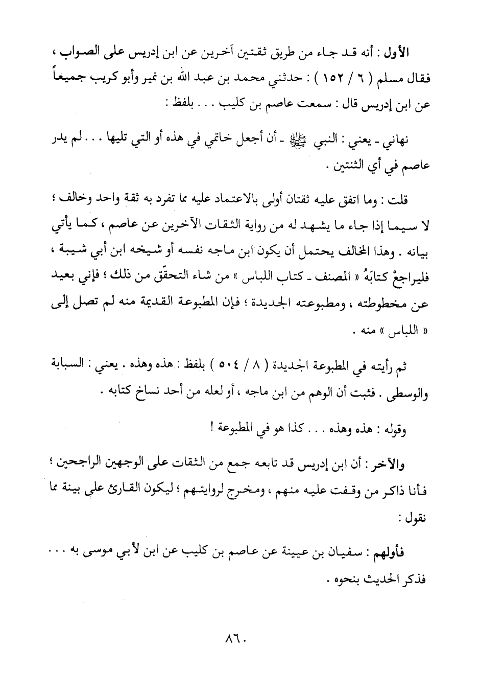 قلت: وما اتفق عليه ثقتان أولى بالاعتماد عليه مما تفرد به ثقة واحد وخالف؛ لا سيما إذا جاء ما يشهد له من رواية الثقات الآخرين عن عاصم، كما يأتي بيانه. وهذا المخالف يحتمل أن يكون ابن ماجه نفسه أو شيخه ابن أبي شيبة، فليراجع كتابه "المصنف - كتاب اللباس" من شاء التحقق من ذلك؛ فإني بعيد عن مخطوطته، ومطبوعته الجديدة؛ فإن المطبوعة القديمة منه لم تصل إلى "اللباس" منه.