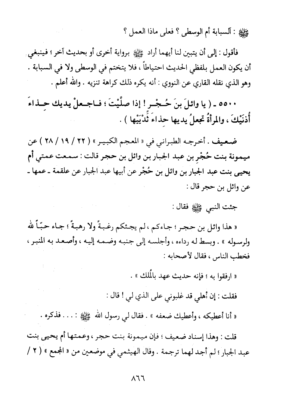 5500 - (يا وائل بن حجر! إذا صليت؛ فاجعل يديك حذاء أذنيك، والمرأة تجعل يديها حذاء ثدييها) .