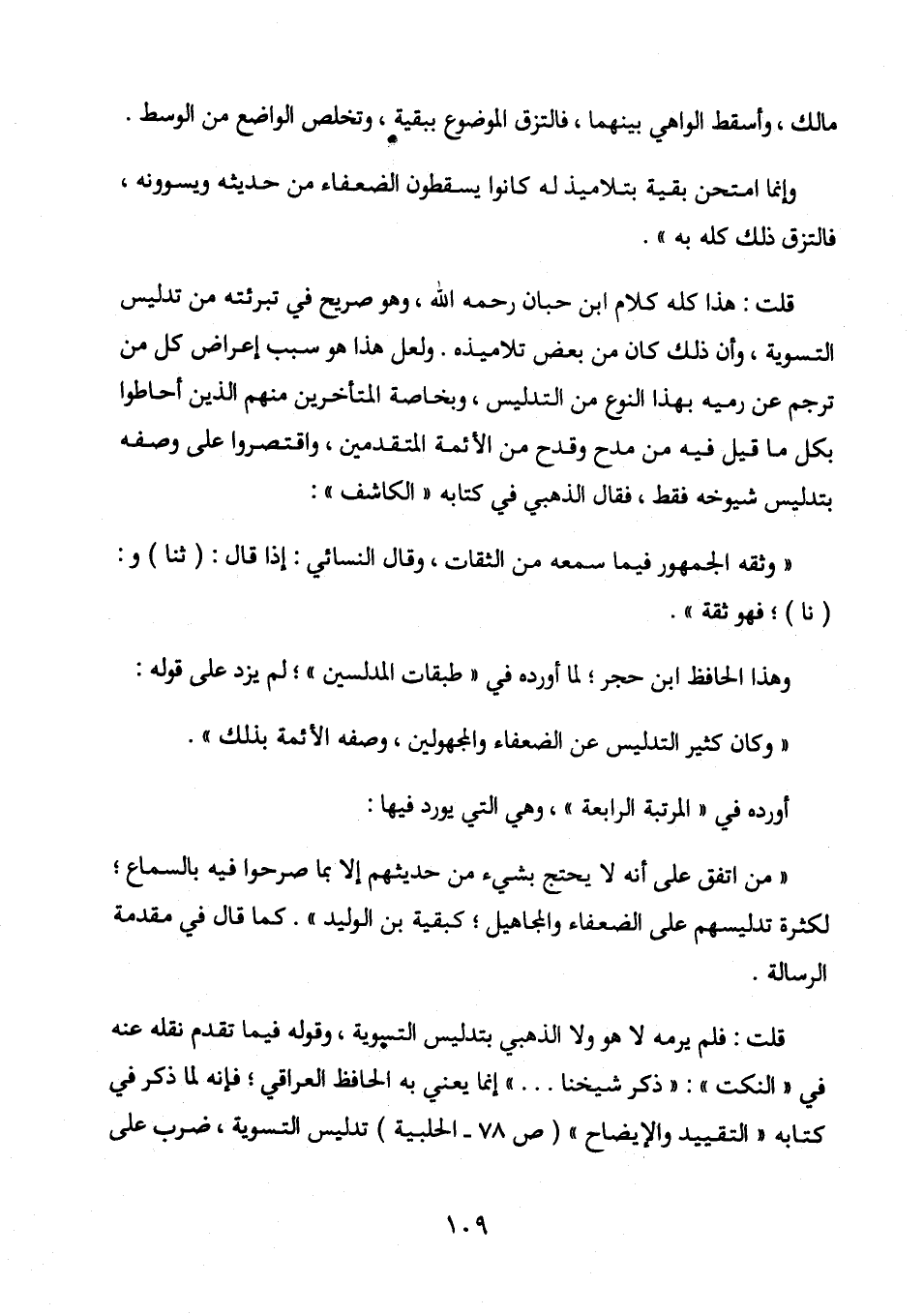قلت: هذا كله كلام ابن حبان رحمه الله، وهو صريح في تبرئته من تدليس التسوية، وأن ذلك كان من بعض تلاميذه. ولعل هذا هو سبب إعراض كل من ترجم عن رميه بهذا النوع من التدليس، وبخاصة المتأخرين منهم الذين أحاطوا بكل ما قيل فيه من مدح وقدح من الأئمة المتقدمين، واقتصروا على وصفه بتدليس شيوخه فقط، فقال الذهبي في كتابه " الكاشف ":