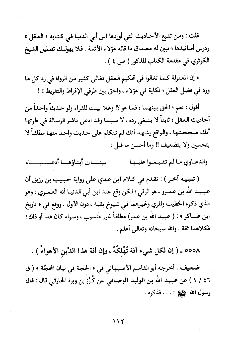 قلت: ومن تتبع الأحاديث التي أوردها ابن أبي الدنيا في كتابه (العقل) ودرس أسانيدها؛ تبين له مصداق ما قاله هؤلاء الأئمة. فلا يهولنك تضليل الشيخ الكوثري في مقدمة الكتاب المذكور (ص4) :