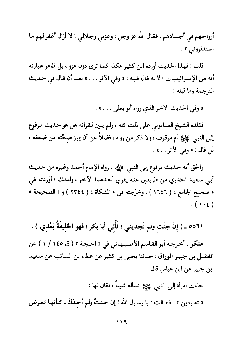 فقلده الشبخ علي الصابوني على ذلك كله، ولم يبين لقرائه هل هو حديث مرفوع إلى النبي صلى الله عليه وسلم أم موقوف، ولا ذكر من رواه، فضلا عن أن يميز صحته من ضعفه، بل قال: (وفي الأثر. . .) .