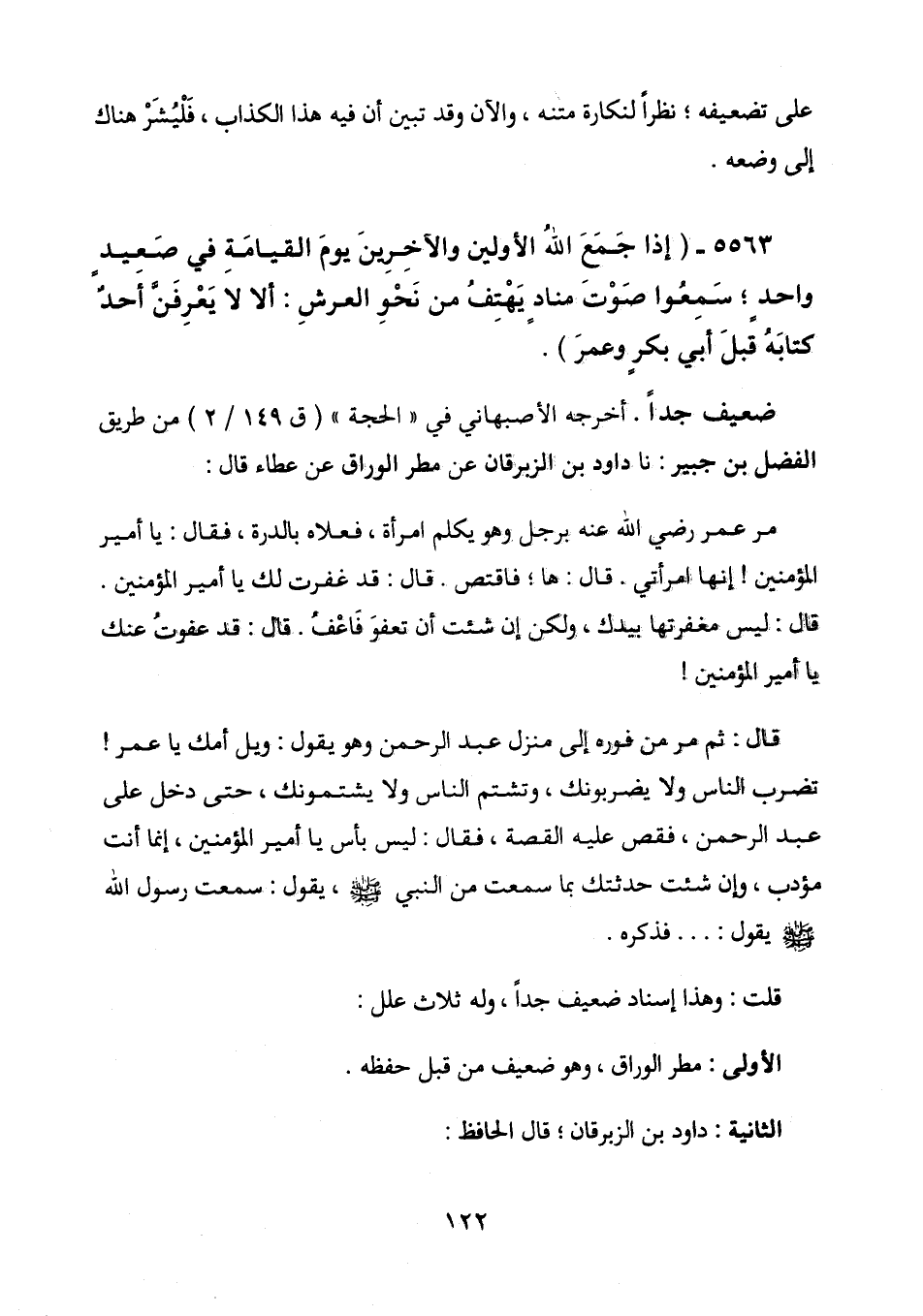 5563 - (إذا جَمَعِ اللهُ الأولين والآخِرِينَ يومَ القيامَةِ في صعيد واحد؛ سَمعُوا صَوْت مناد يَهْتِفُ من نَحْوِ العرشِ: ألا لا يَعْرِفَنَّ أَحداً كتابَهُ قًبلَ أبي بكرٍ وعمرَ) .