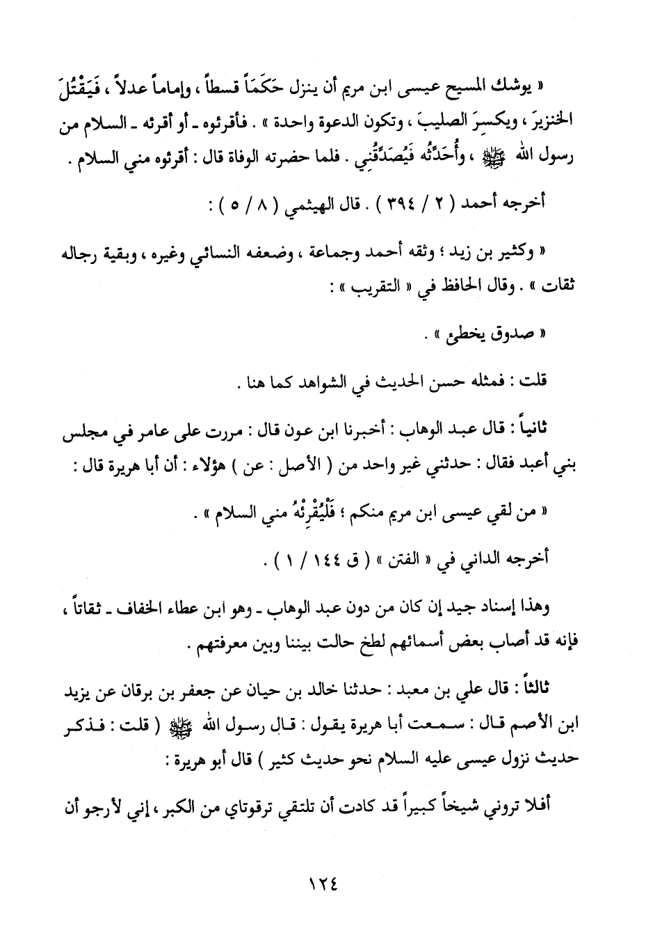 يوشك المسيح عيسى ابن مريم أن ينزل حَكَمَاً قسطاً، وإماماً عدلاً، فَيَقْتُلَ الخنزيرَ، ويكسِرَ الصليبَ، وتكون الدعوة واحدة ". فأقرئوه - أو أقرئه - السلام من رسول الله صلى الله عليه وسلم، وأحدثه فَيُصَذقُنِي.