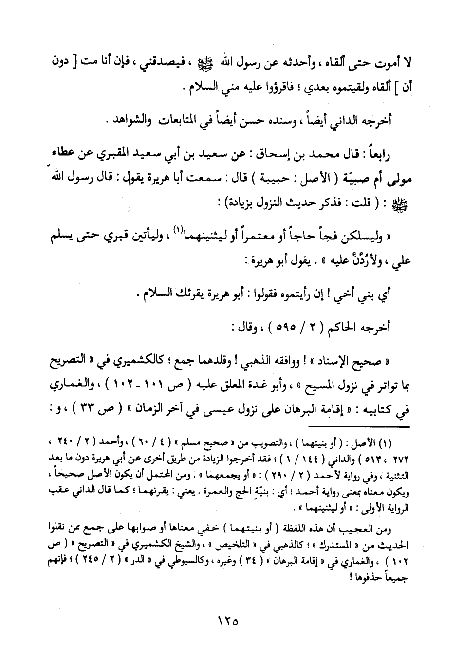 " صحيح الإسناد "! ووافقه الذهبي! وقلدهما جمع؛ كالكشميري في: " التصريح بما تواتر في نزول المسيح " وأبو غدة المعلق عليه (ص 101 - 102) ، والغماري في كتابيه: " إقامة البرهان على نزول عيسى في آخر الزمان " (ص 33) ، و: