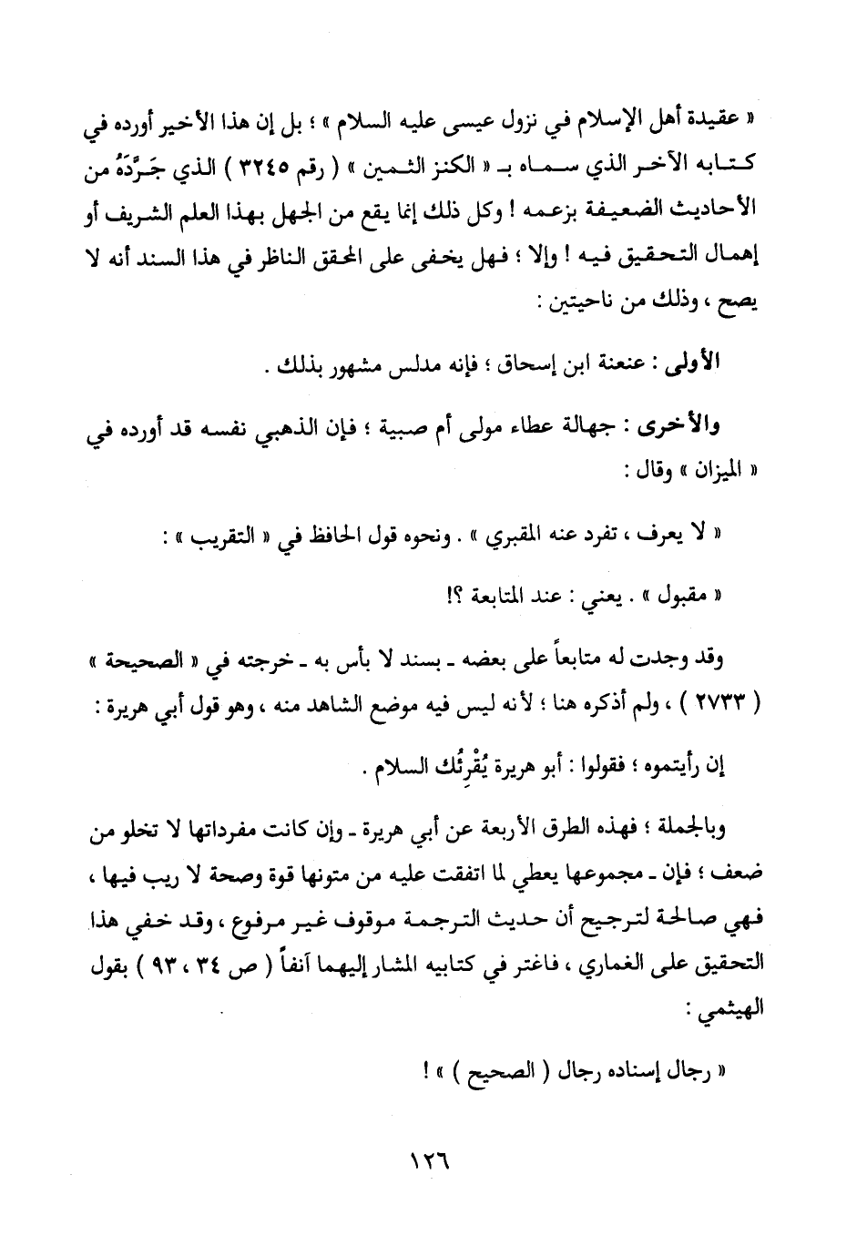 " عقيدة أهل الإسلام في نزول عيسى عليه السلام "؛ بل إن هذا الأخير أورده في كتابه الآخر الذي سماه بـ " الكنز الثمين " برقم (3245) الذي جرده من الأحاديث الضعيفة بزعمه! وكل ذلك إنما يقع من الجهل بهذا العلم الشريف أو إهمال التحقيق فيه! وإلا؛ فهل يخفى على المحقق الناظر في هذا السند أنه لا يصح، وذلك من ناحيتين: