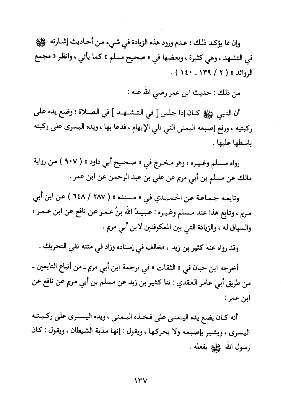 أنه كان يضع يده اليمنى على فخذه اليمنى، ويده اليسرى على ركبته اليسرى، ويشير بإصبعه ولا يحركها، ويقول: إنها مذبة الشيطان، ويقول: كان رسول الله صلى الله عليه وسلم يفعله.