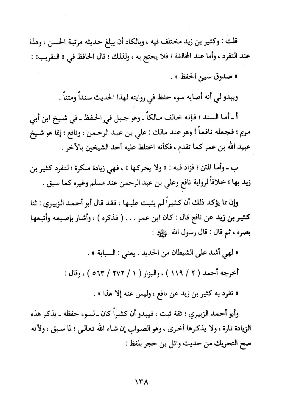 وإن مما يؤكد ذلك أن كثيراً لم يثبت عليها، فقد قال أبو أحمد الزبيري: ثنا كثير بن زيد عن نافع قال: كان ابن عمر. . . (فذكره) ، وأشار بإصبعه وأتبعها بصره، ثم قال: قال رسول الله صلى الله عليه وسلم: