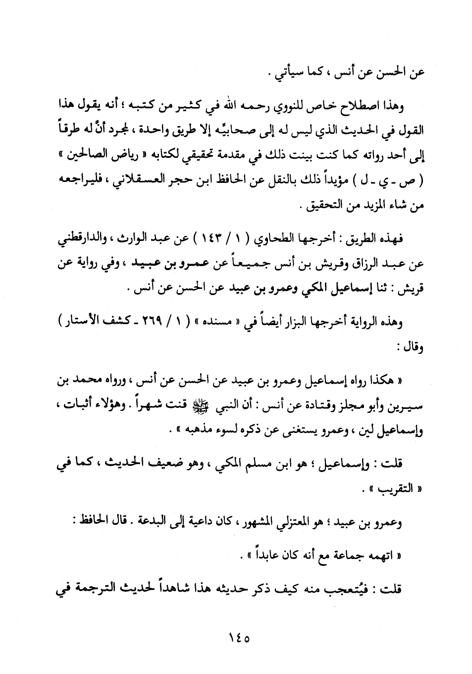 " هكذا رواه إسماعيل وعمرو بن عبيد عن الحسن عن أنس، ورواه محمد بن سيرين وأبو مجلز وقتادة عن أنس: أن النبي صلى الله عليه وسلم قنت شهراً. وهؤلاء أثبات، وإسماعيل لين، وعمرو يستغنى عن ذكره لسوء مذهبه ".