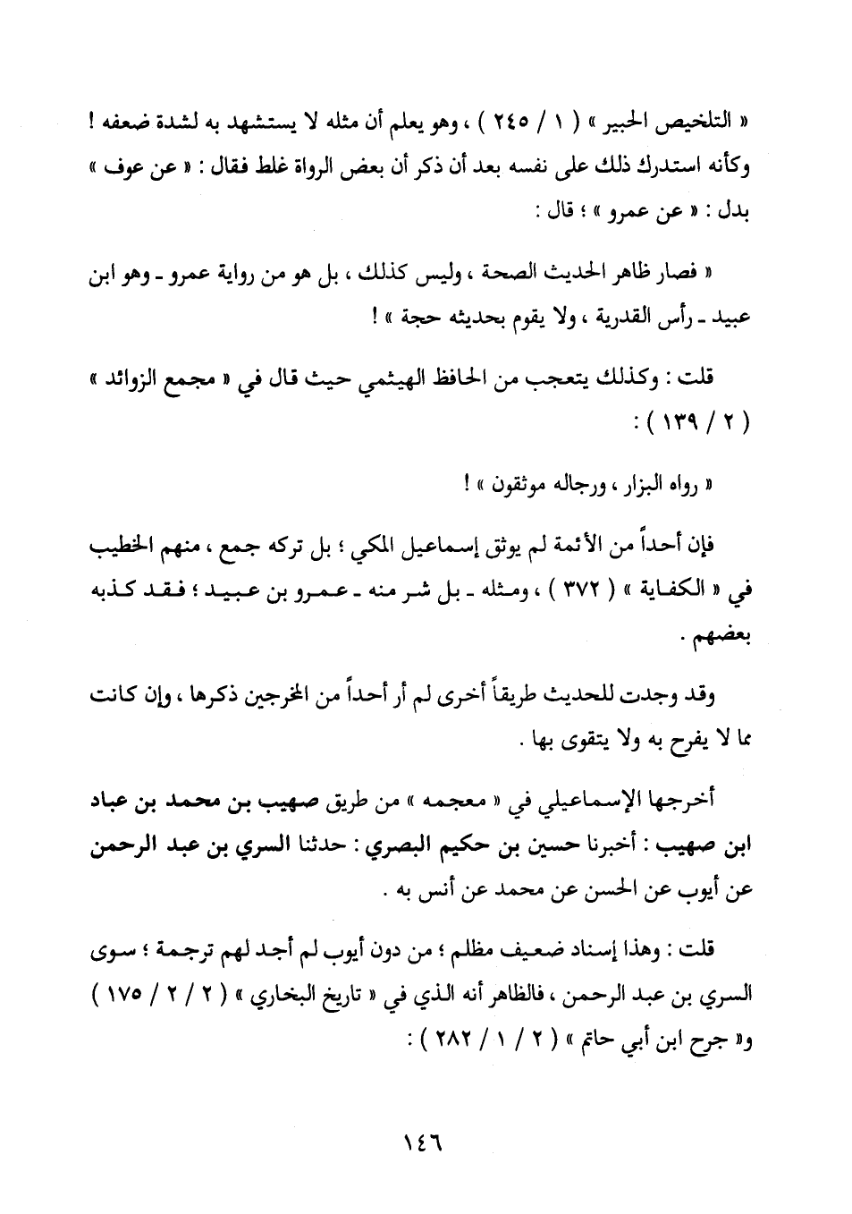 فإن أحداً من الأئمة لم يوثق إسماعيل المكي؛ بل تركه جمع، منهم الخطيب في " الكفاية " (372) ، ومثله - بل شر منه - عمرو بن عبيد؛ فقد كذبه بعضهم.
